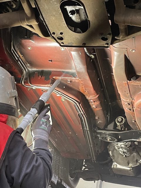 Dort, wo der Zahn der Zeit bereits genagt hat, setzen wir bei TLS auf punktgenaue Lasereinigung. Wir tragen Oxidschichten und tiefsitzenden Rost ab, ohne das Blech thermisch zu belasten oder zu verformen. Nach dieser porentiefen Vorbereitung erfolgt die Krönung: Die Applikation von Mike Sanders Korrosionsschutzfett. Durch das Erhitzen auf ca. 120 °C dringt das Fett dank seiner extremen Kriechfähigkeit in jede Hohlraum-Falz vor. Es bleibt dauerhaft aktiv und versiegelt Ihren Unterboden sowie alle Hohlräume gegen Streusalz, Sauerstoff und Feuchtigkeit.